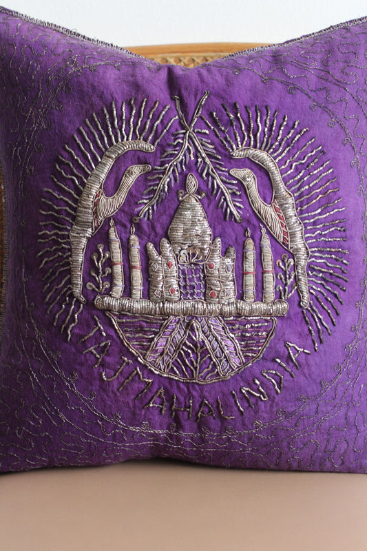 1940s Taj Mahal Silver Embroidered Indian Pillow