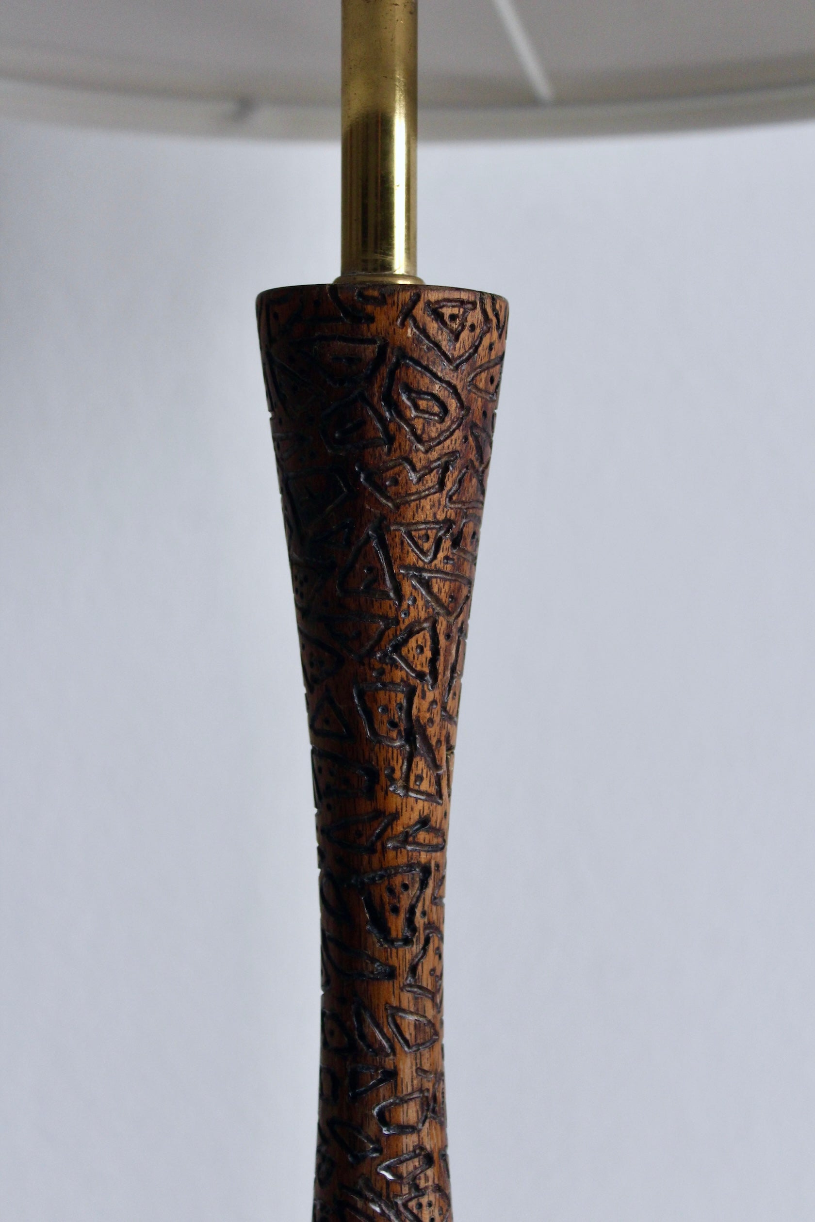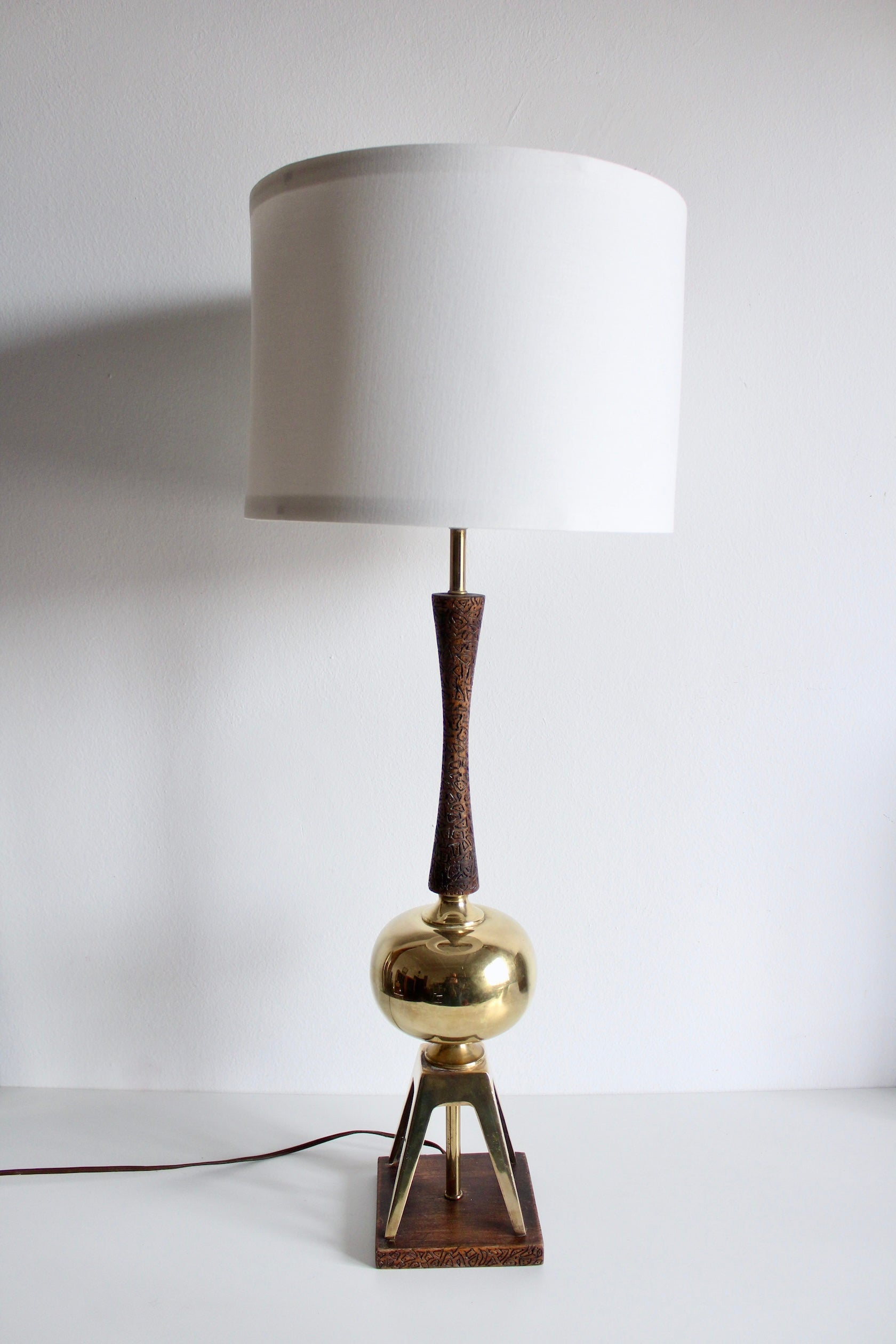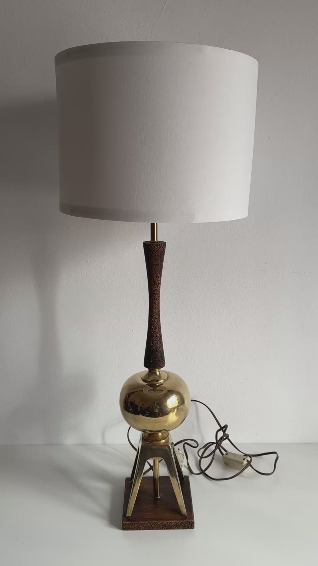1960s Midcentury European Brass and Carved Wood Table Lamp