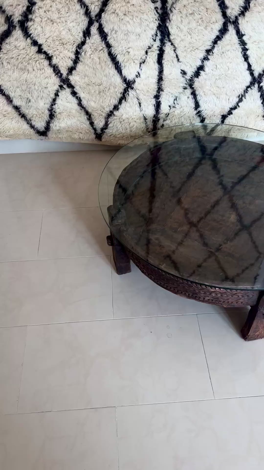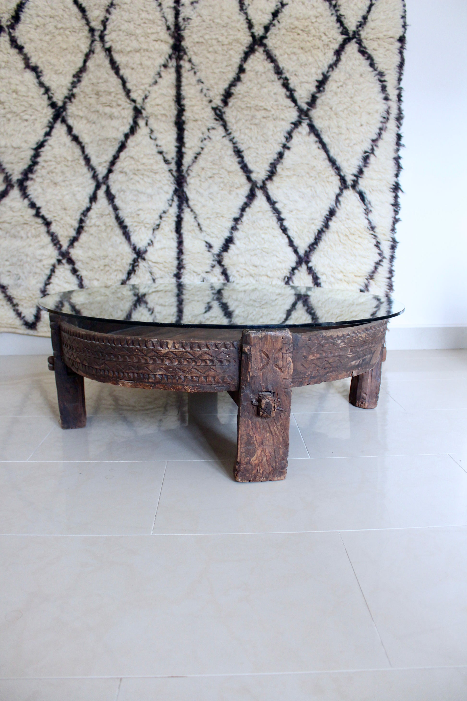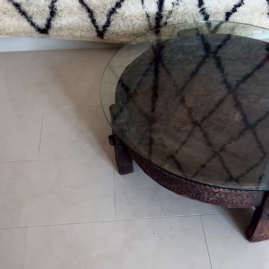 Antique Solid Wood Indian Coffee Table with Glass Top