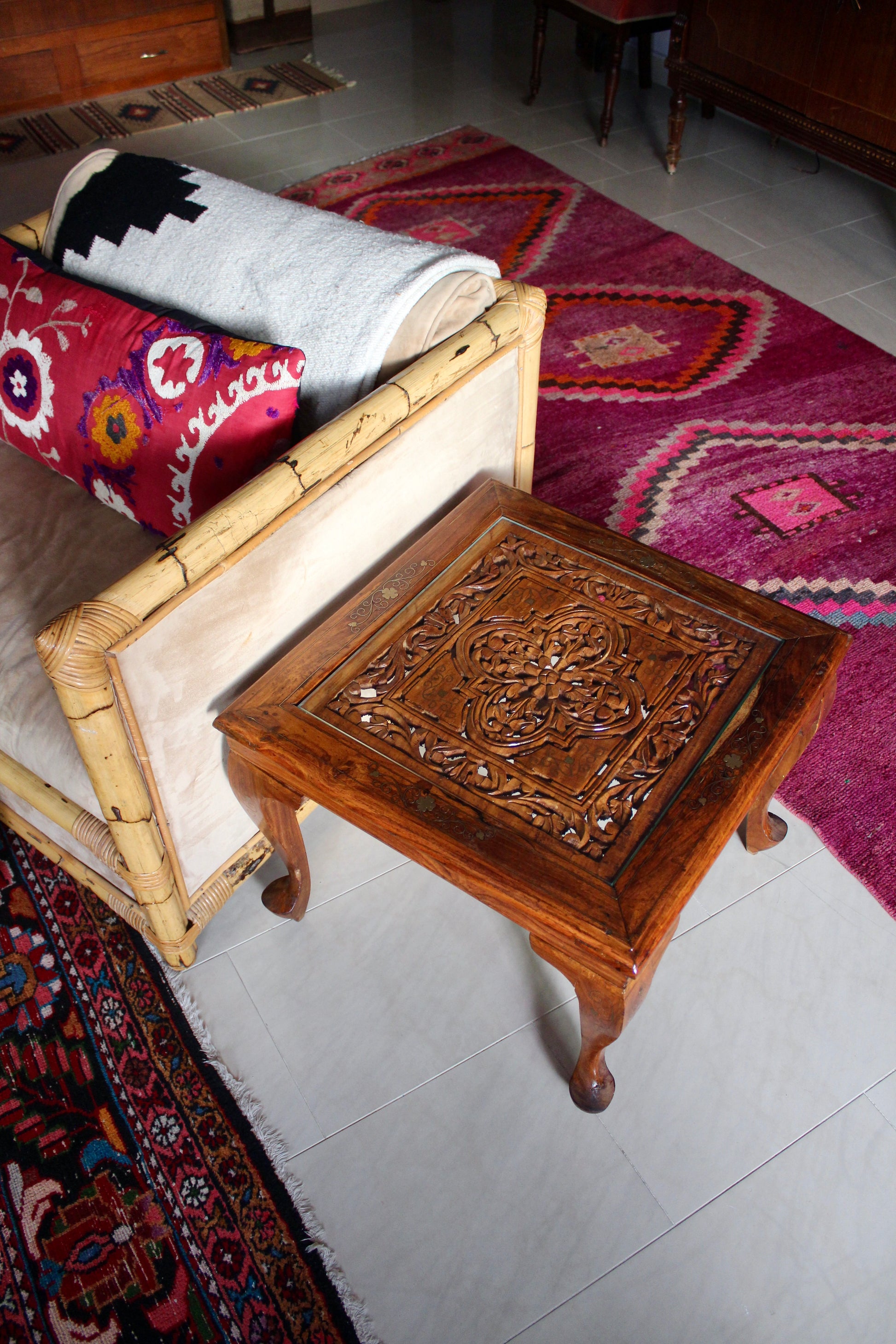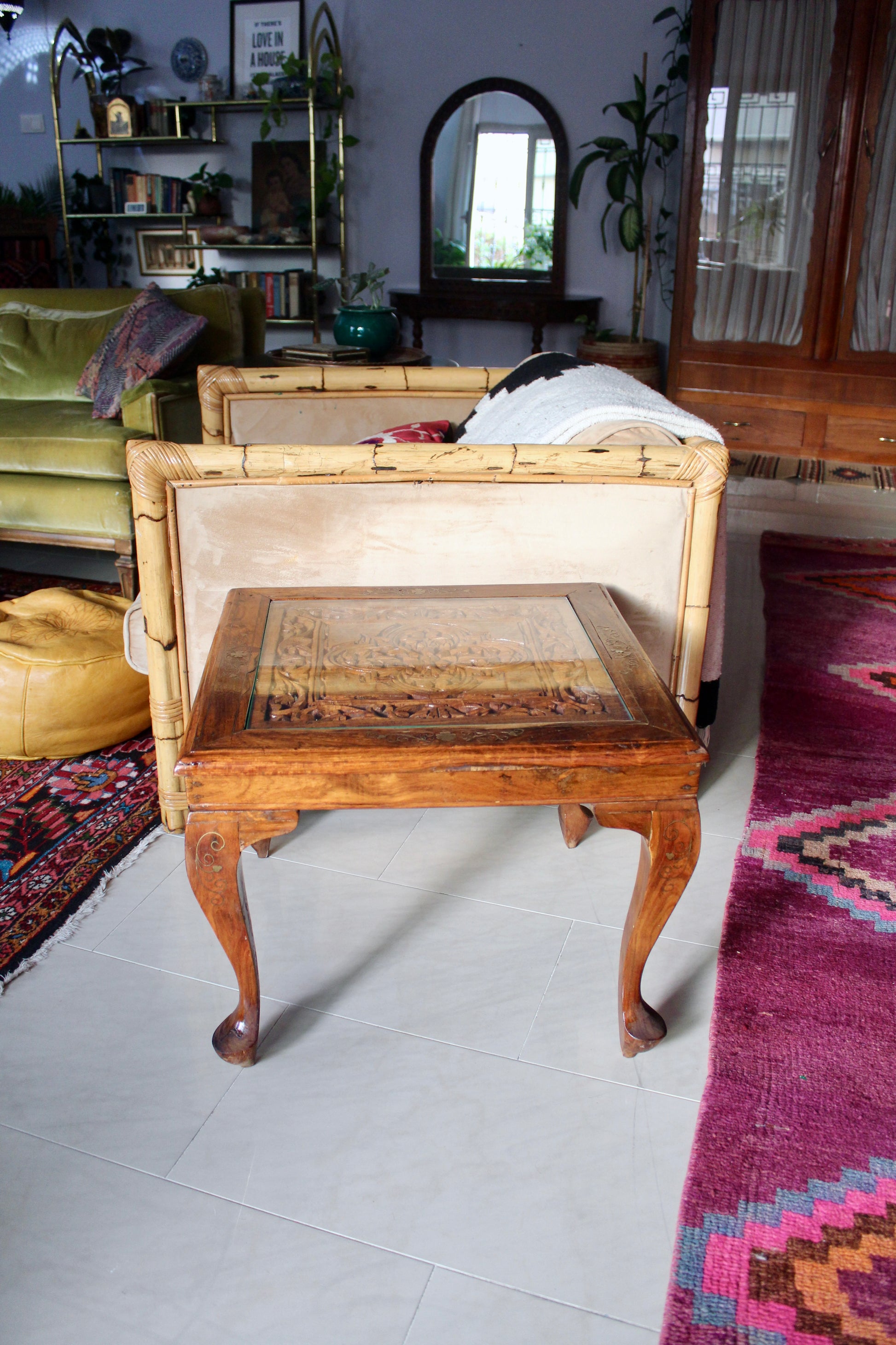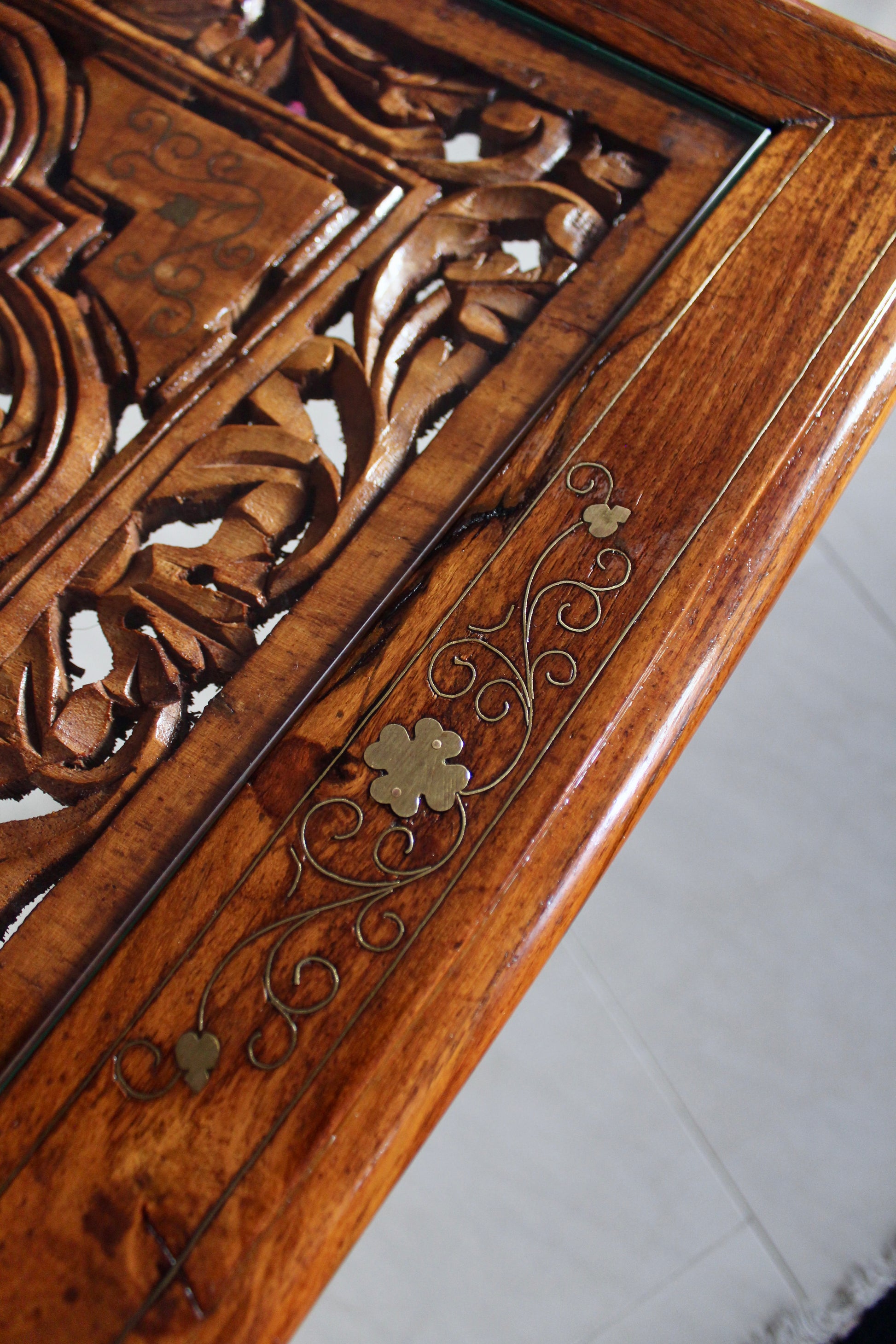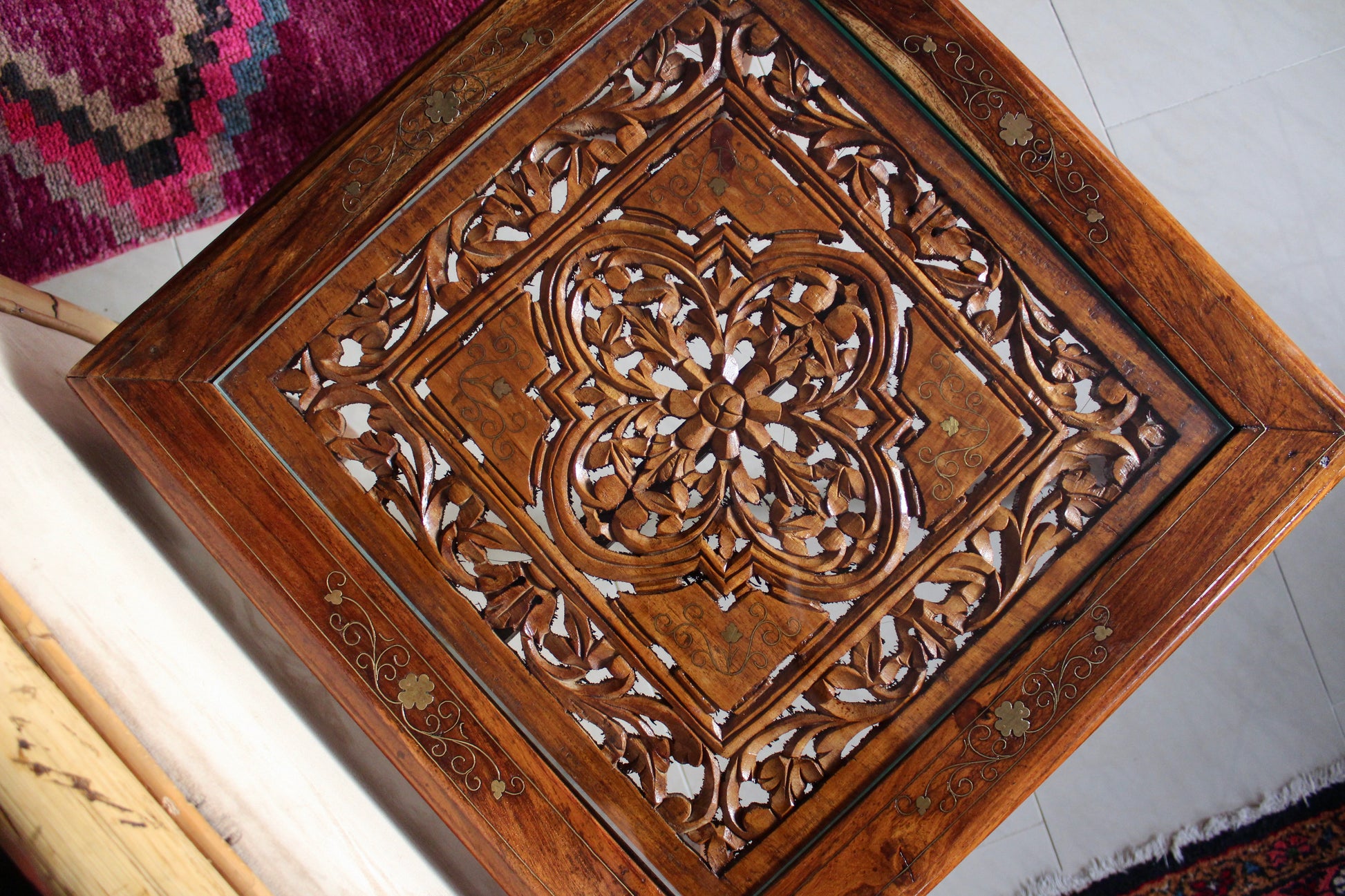 Absolutely gorgeous table with handvarved features and brass inlay. Topped with a piece of glass. Such a stunning example of vintage handmade Indian furniture. Likely 40-50 years old.
