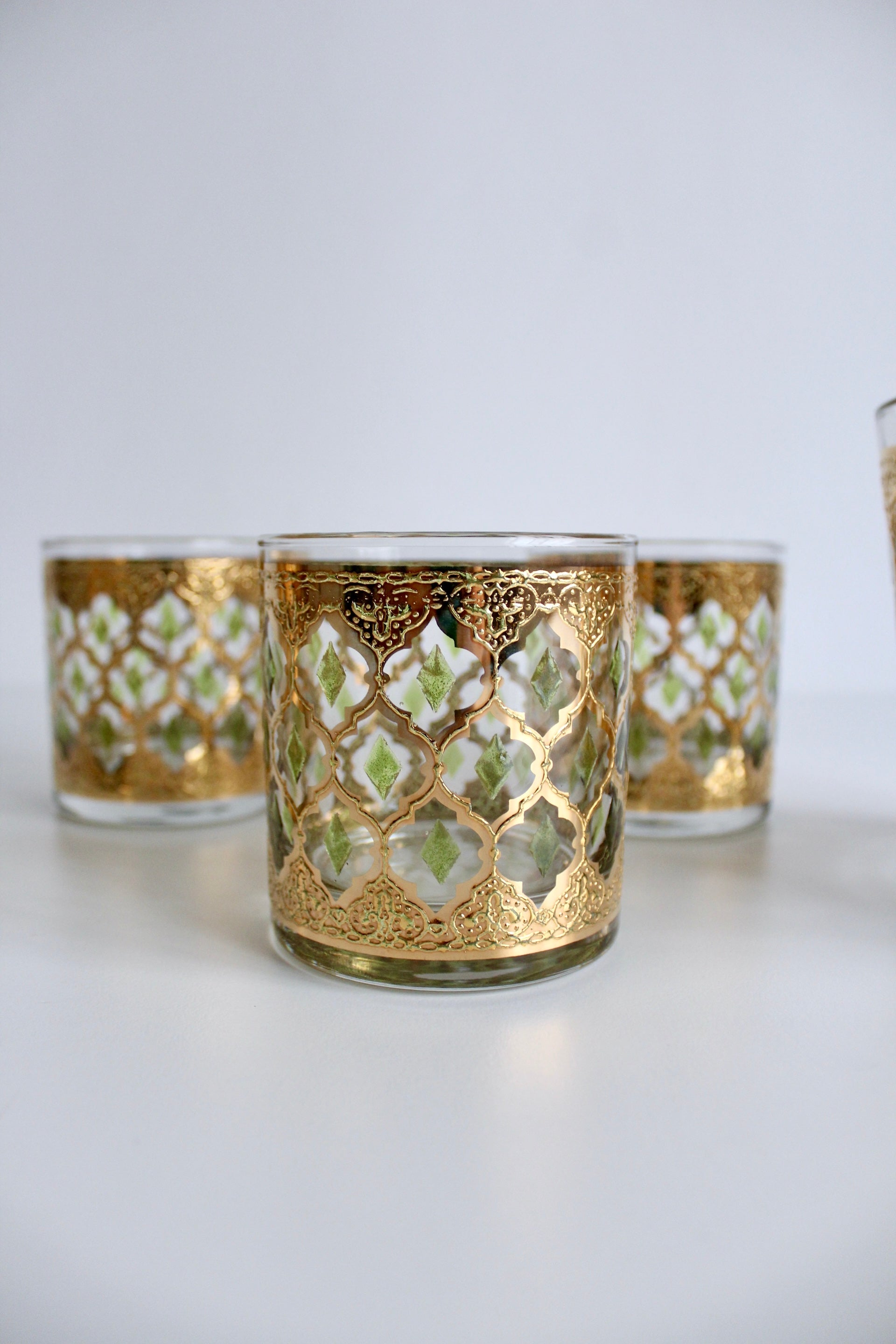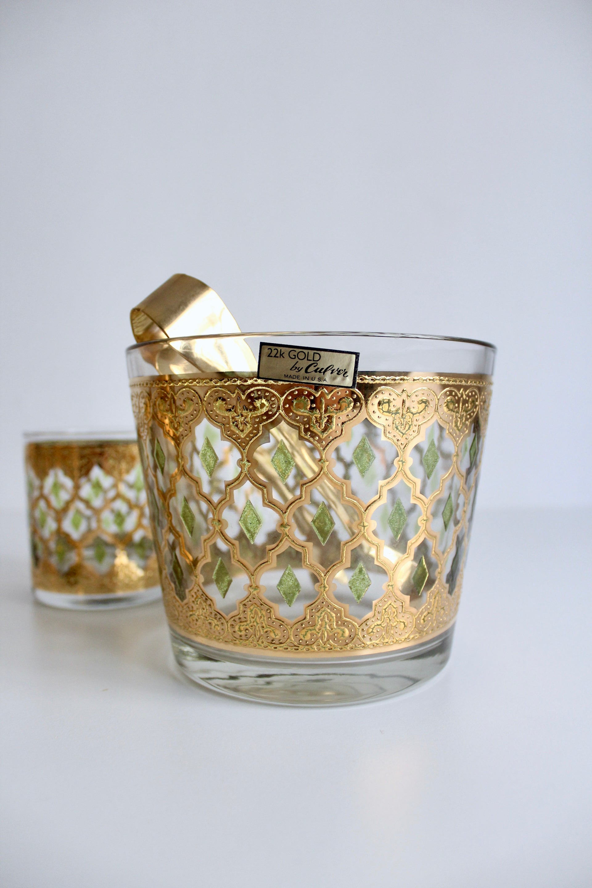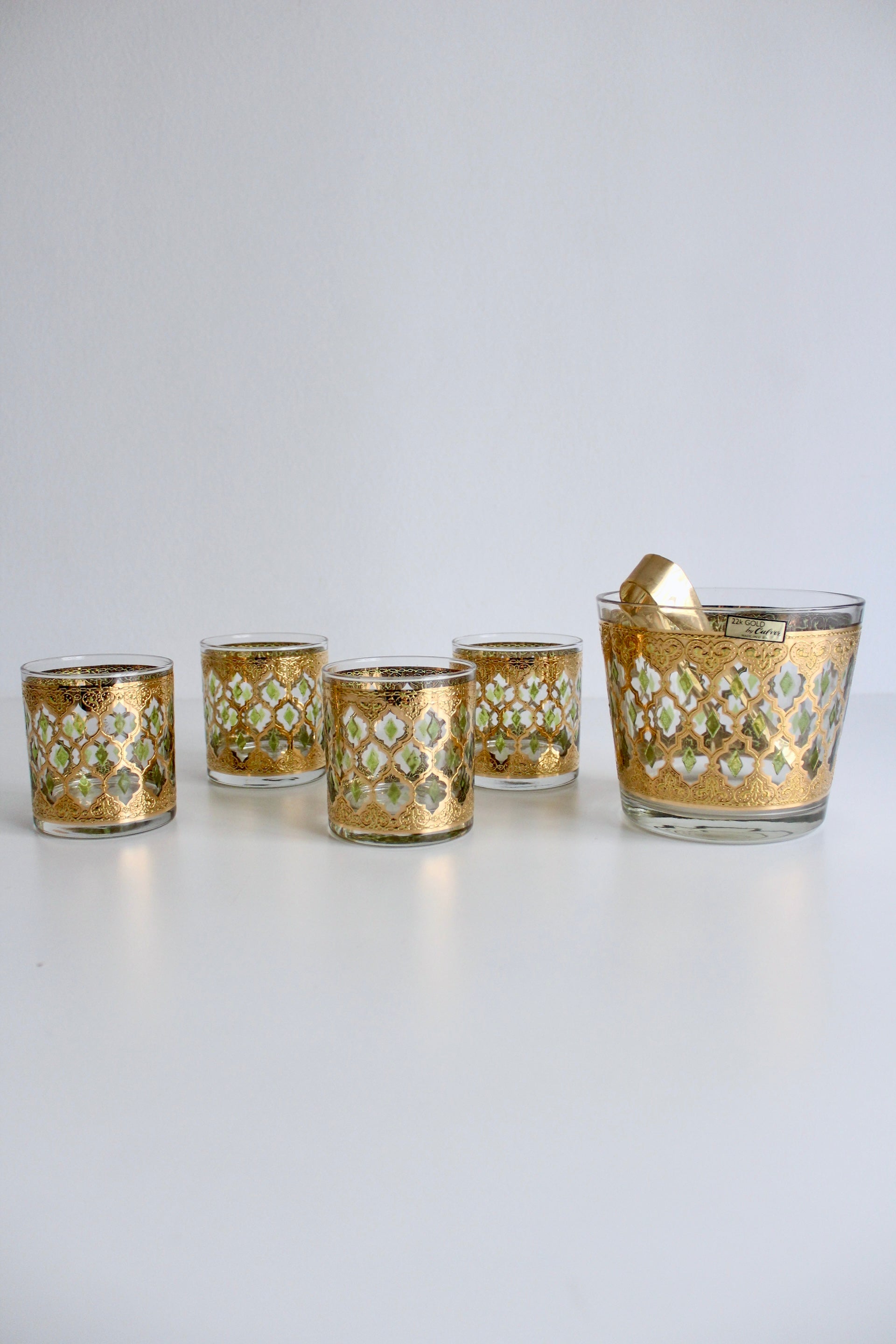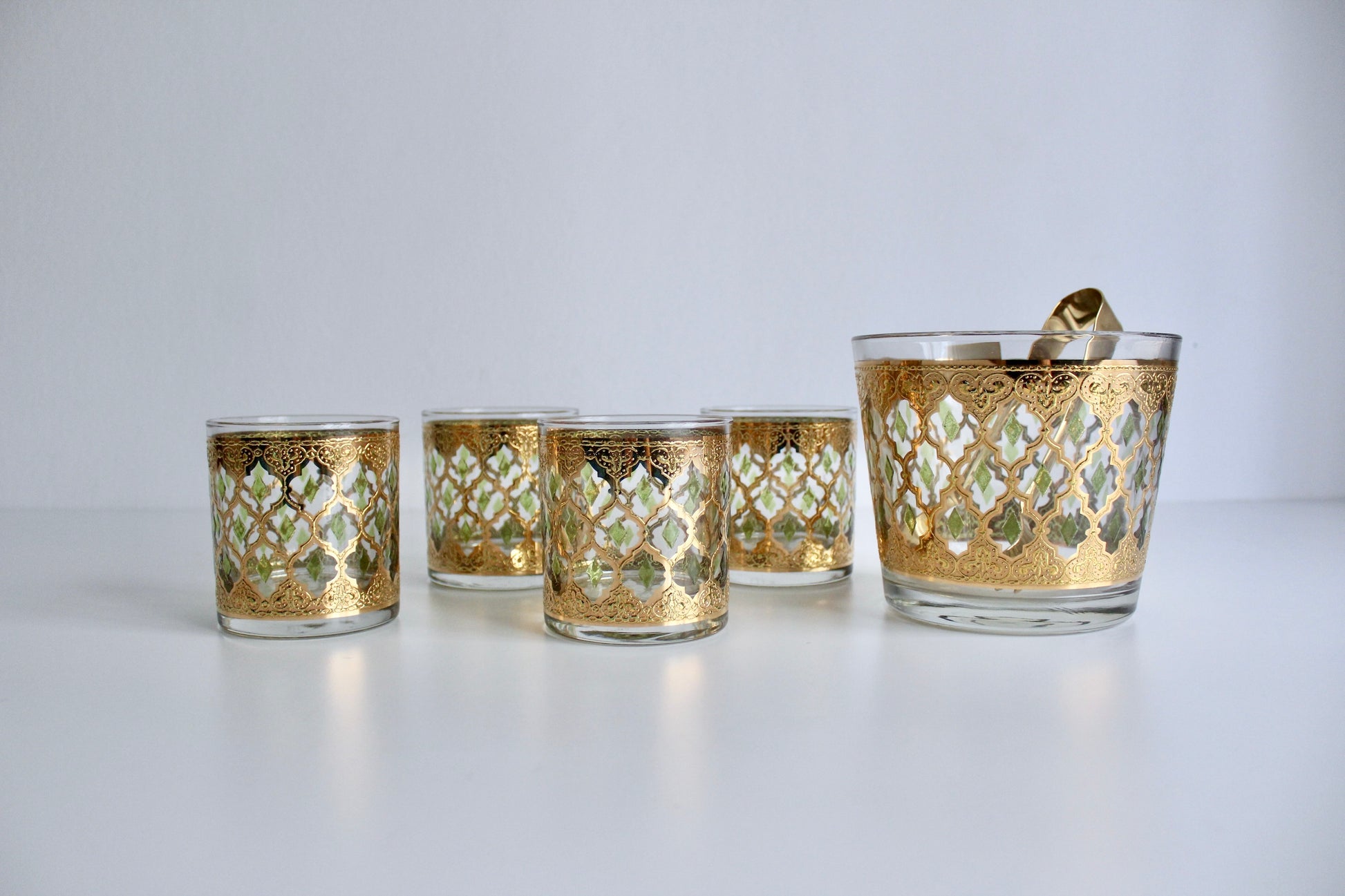 Culver Midcentury 22K Gold Moroccan Lattice Barware Set - Ice Bucket and Four Rock Glasses