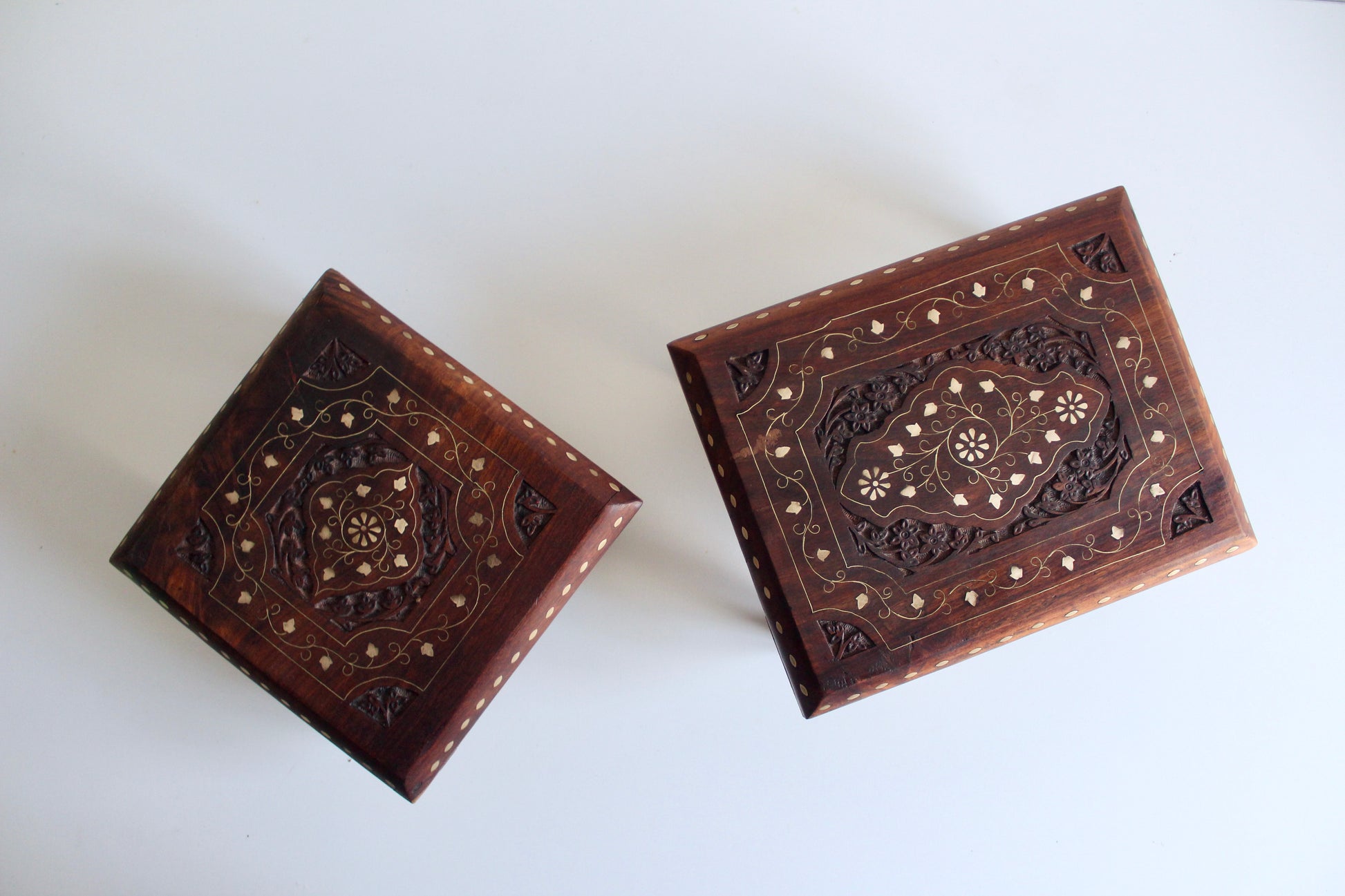 Sweet pair of handmade tables perfect for use in diwaniya seating. Low to the ground to hold your tea. I also like to use them as plant stands or platforms in my bookshelf or table top decor. This is a listing for the set of two.