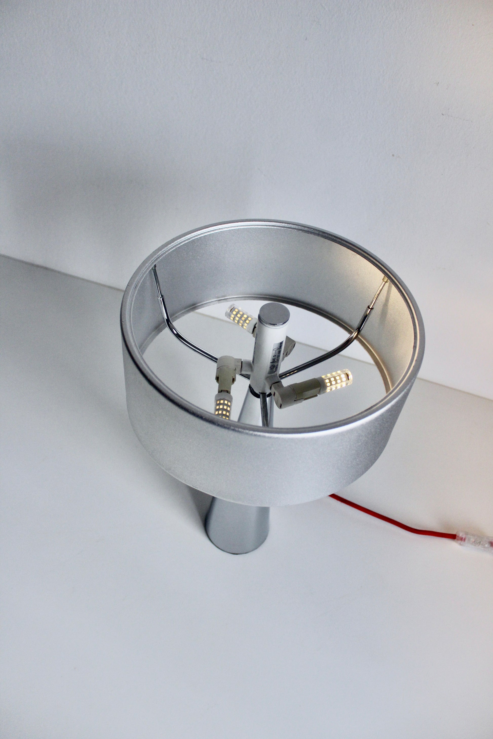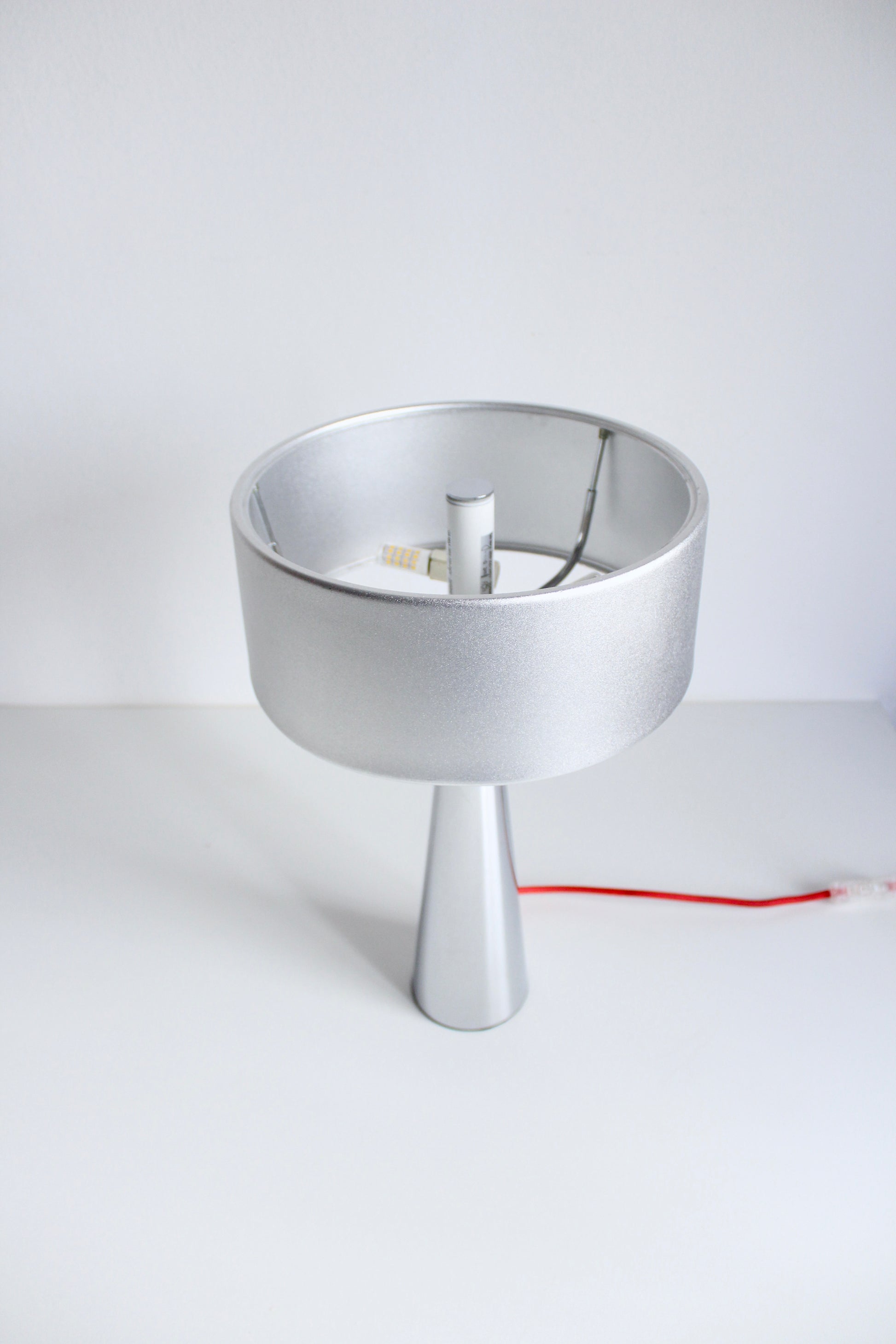 Such a cool statement lamp. The base is super heavy and the entire piece is made of metal including the shade. There was at one point glass on the top of the lamp to diffuse the light, but the glass is not longer intact. In the current state the lamps gives off a really beautiful glow.