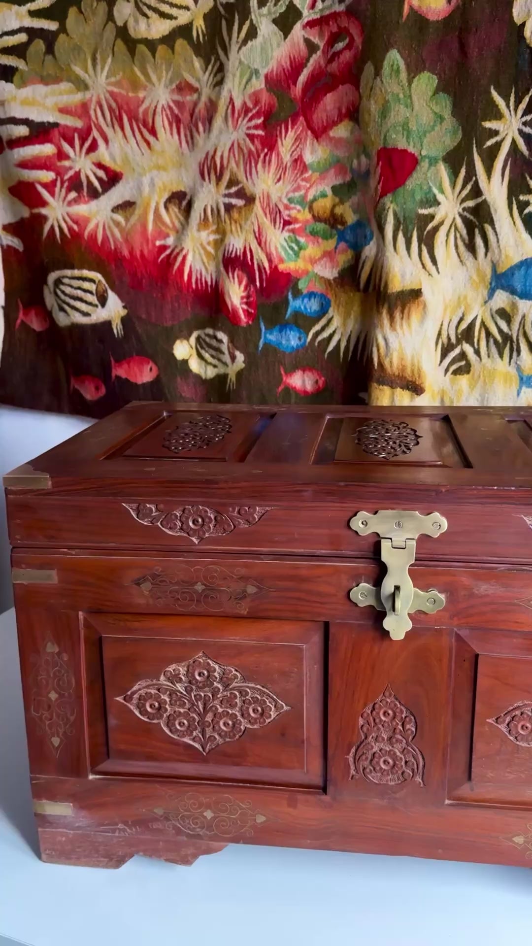 Gorgeous hand carved and brass inlaid chest. Please watch the video for additional information.