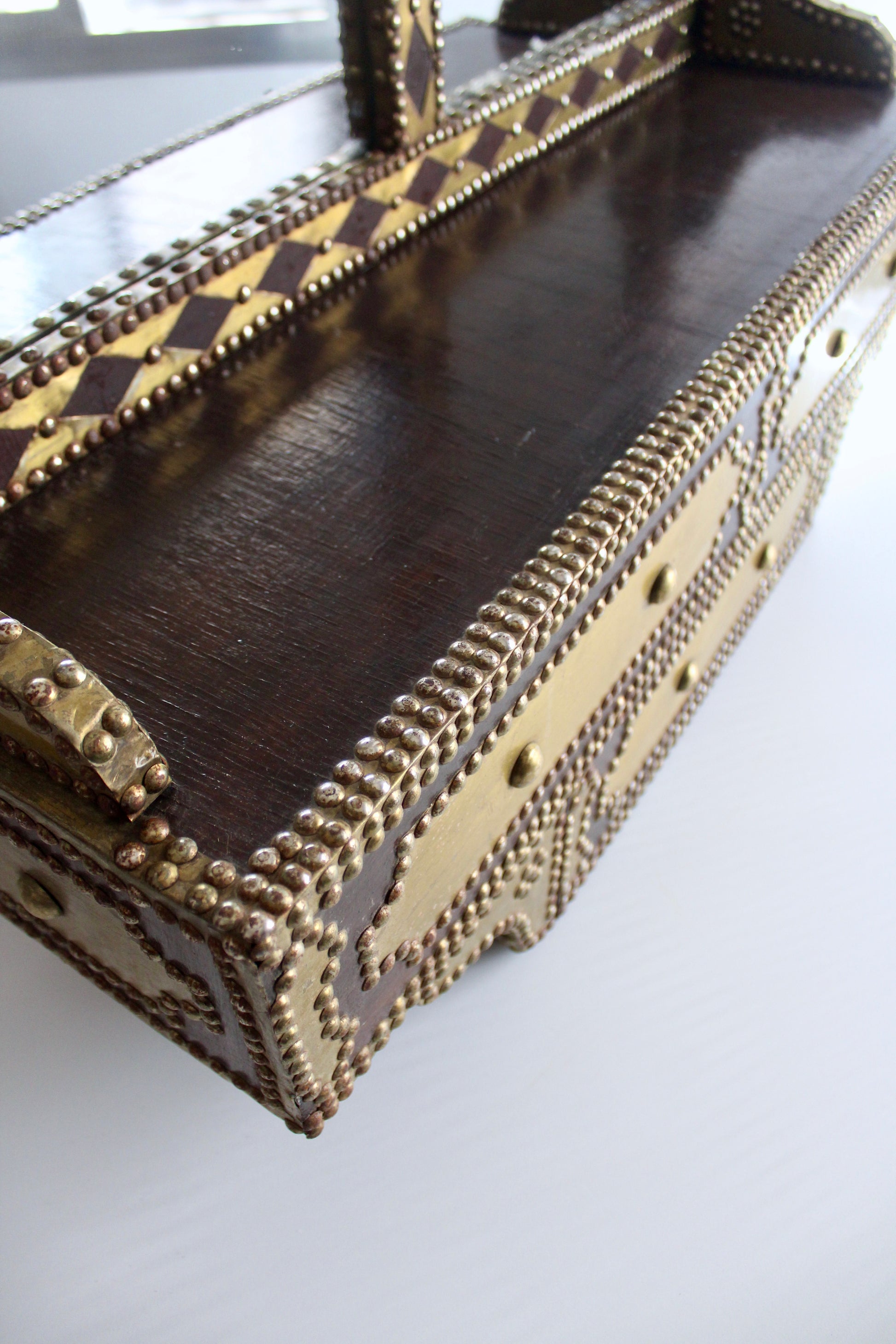 Gorgeous wood and brass double mirror full of studs and cut metal detailing. Traditional attributed to the dhow builders of the Gulf. Many buildings began creating pieces like this in the middle of the 20th century when the need for traditional dhow building began to dwindle.