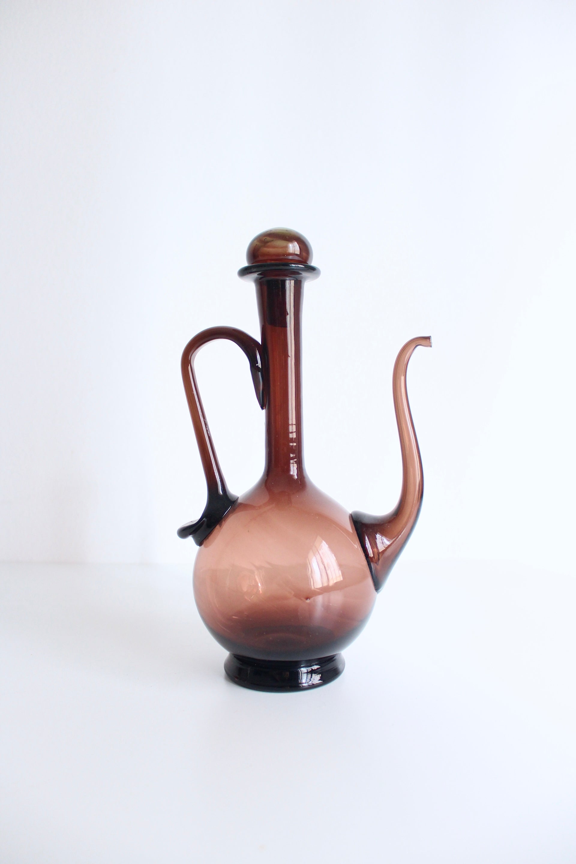 Lovely vintage European handblown glass Ewer. The design of this piece mimics the Middle Eastern tradition but was made by European glassmakers for import to the Middle East. Truly incredible piece with hand painted decor.