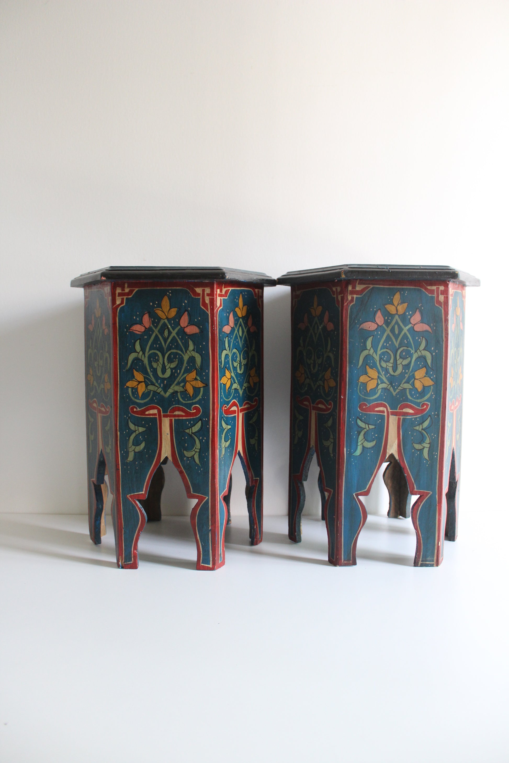 This listing its for this set of two vintage handprinted moroccan side tables. Truly a stunning pair. I love the colors and the very classic design. They're in vintage condition, but have been protected with some lacquer to ensure they are ready to be used for normal household use. Be careful when placing hot drinks or even cold drinks on handpainted furniture as they can damage the surface. Best if you use coasters.