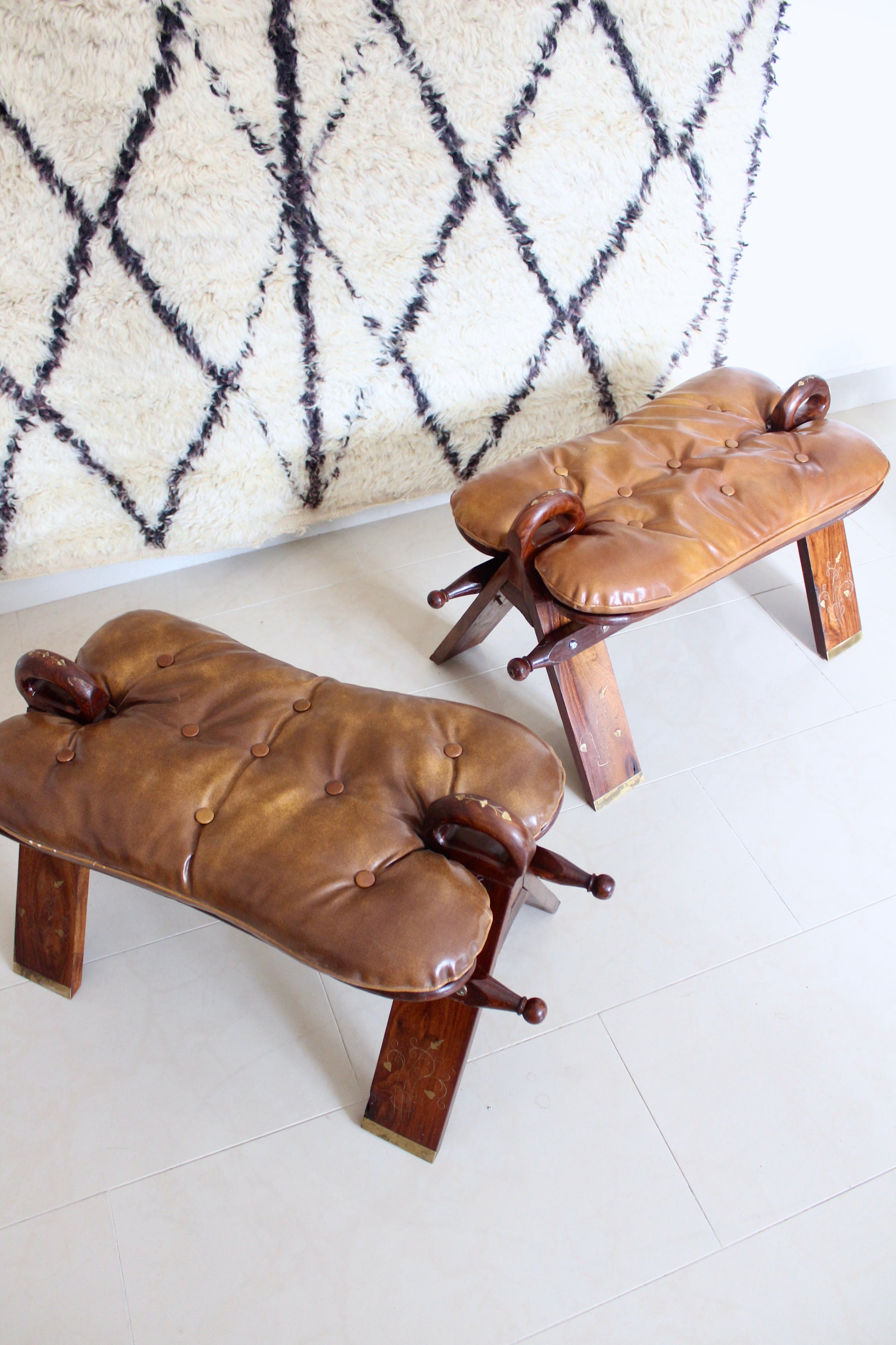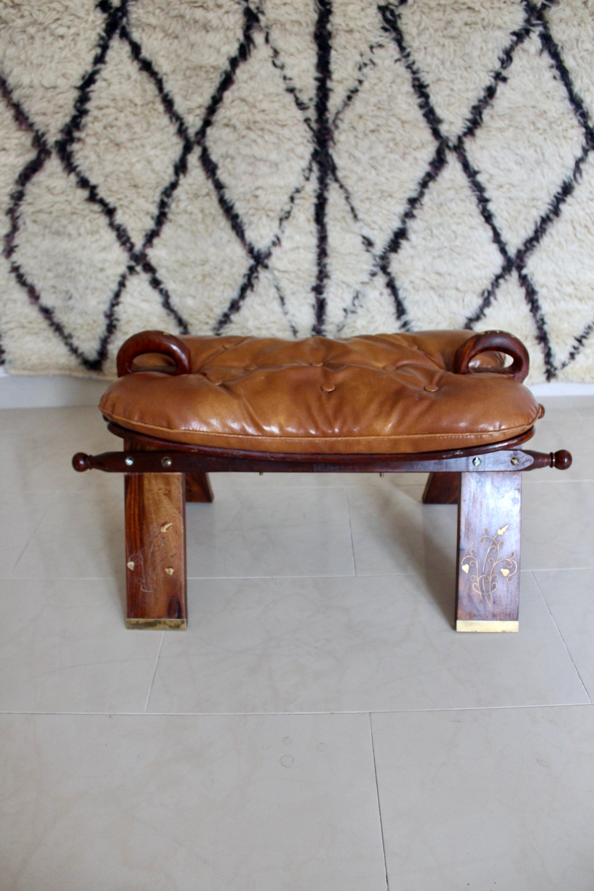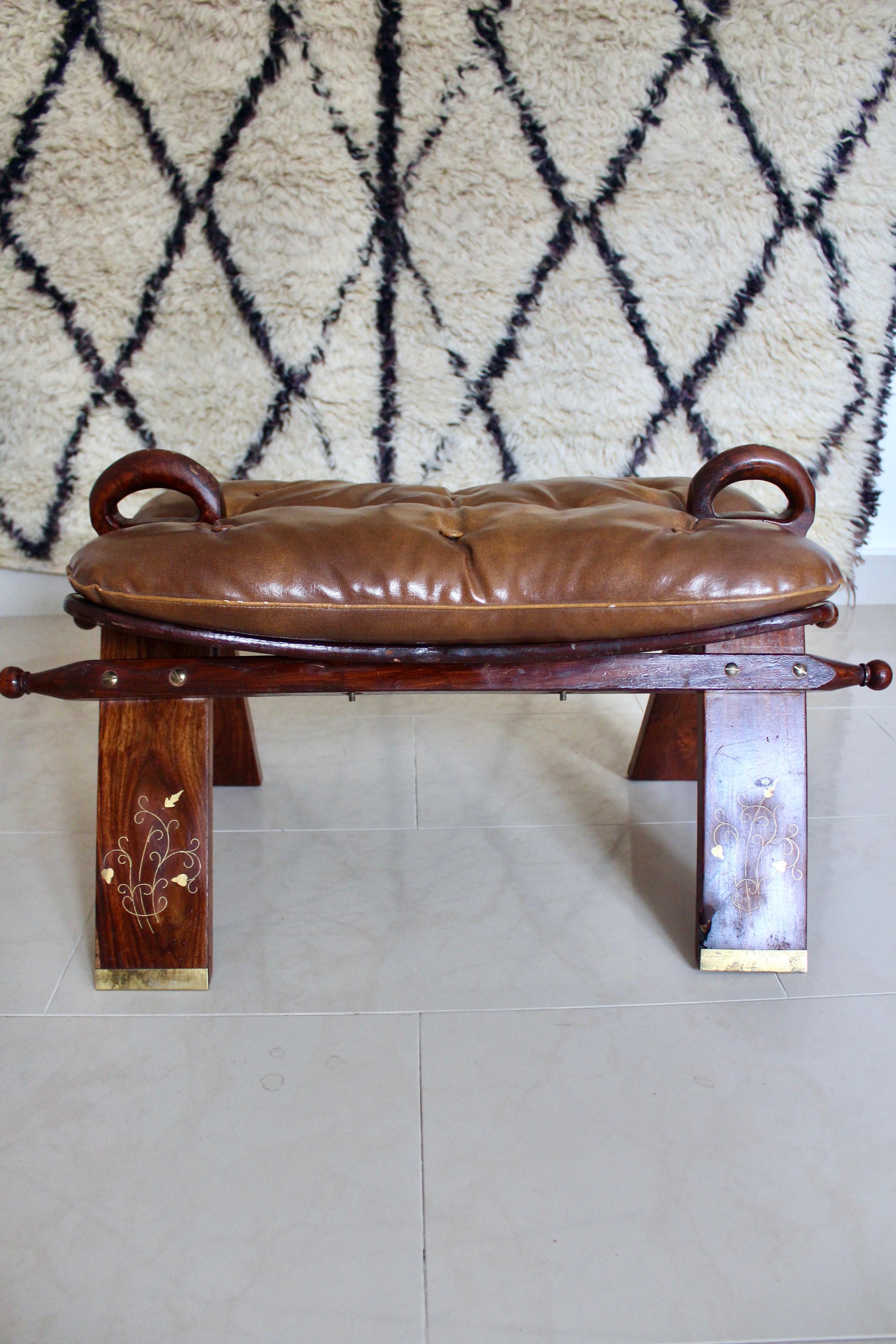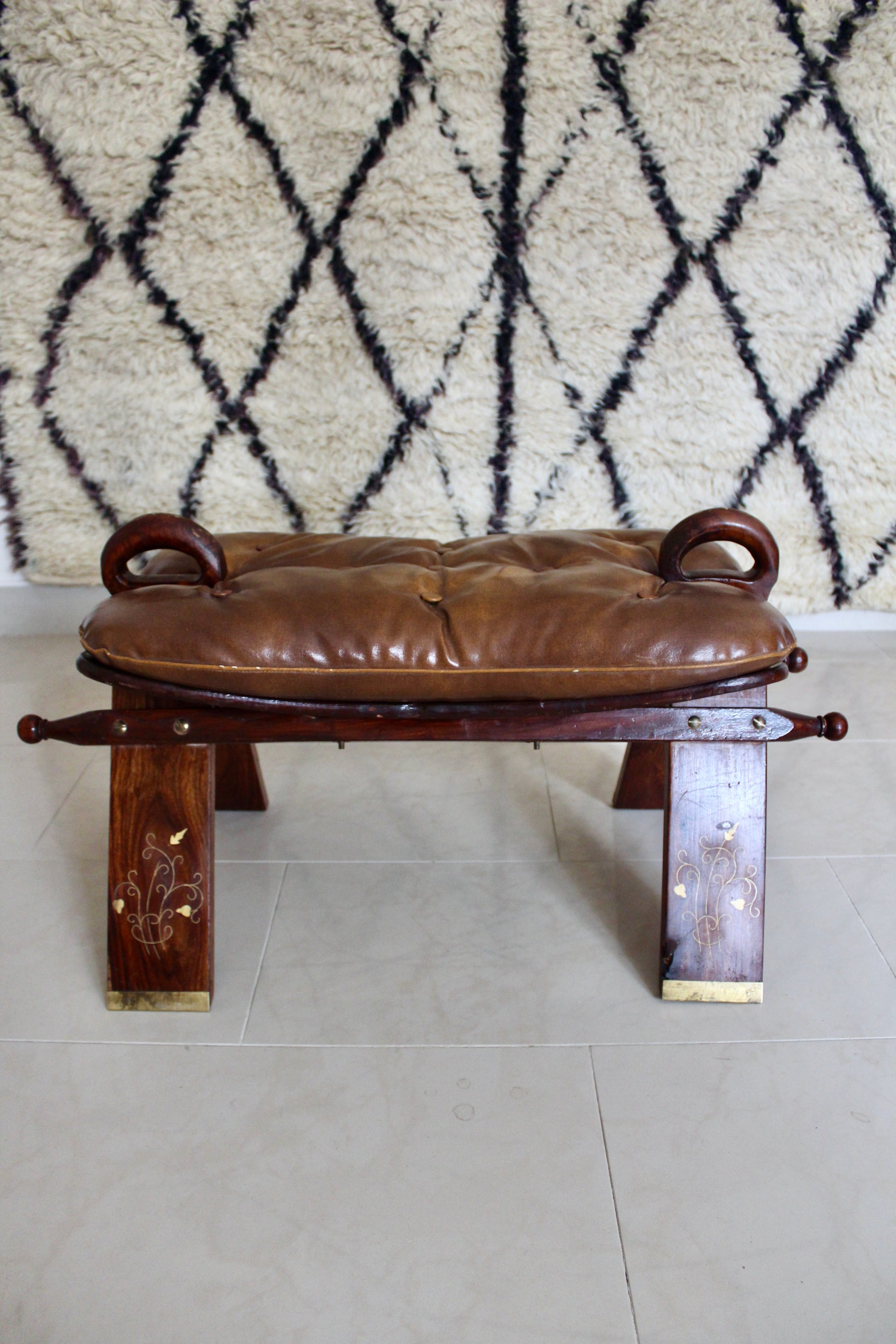 Vintage Pakistani Rosewood and Brass Inlay Footstool