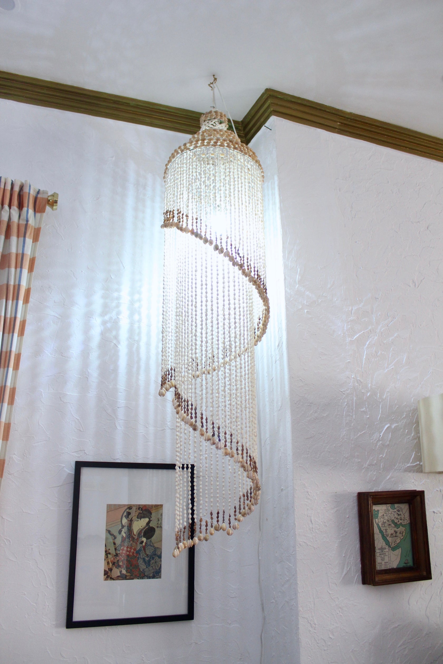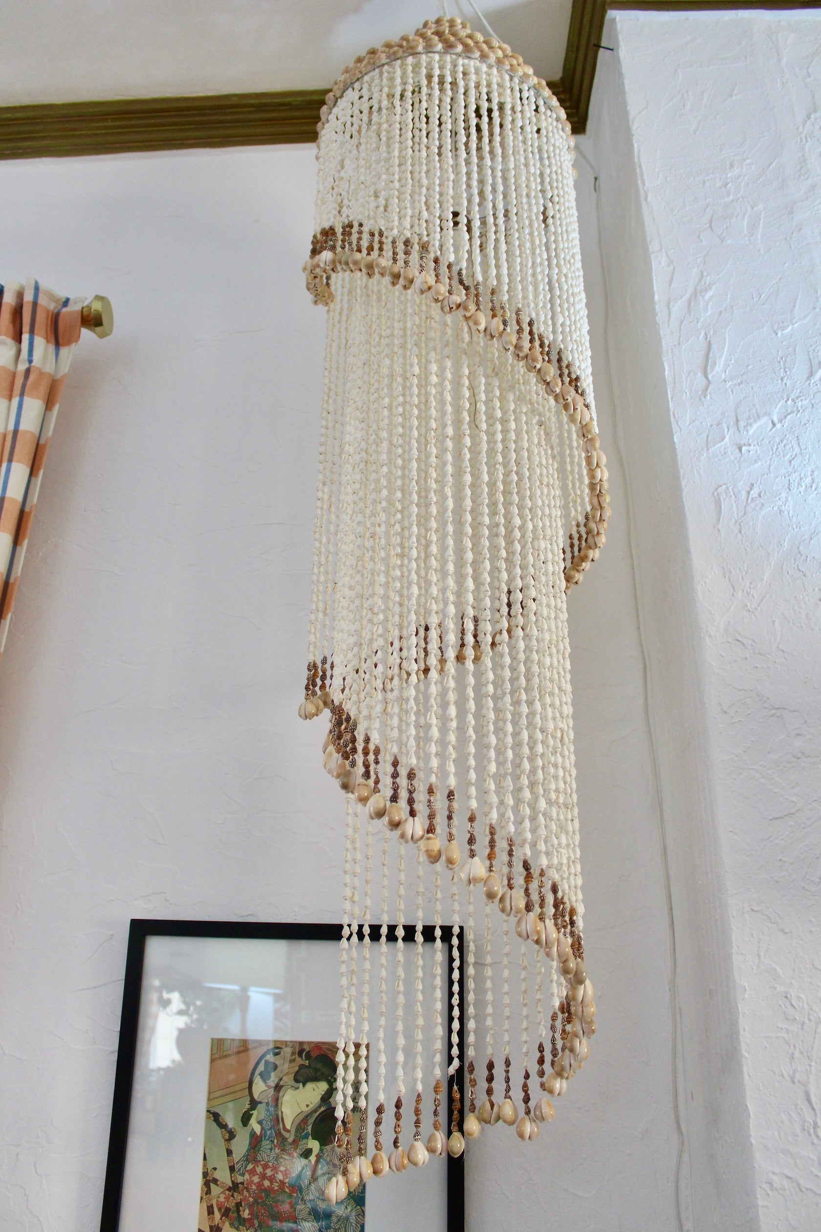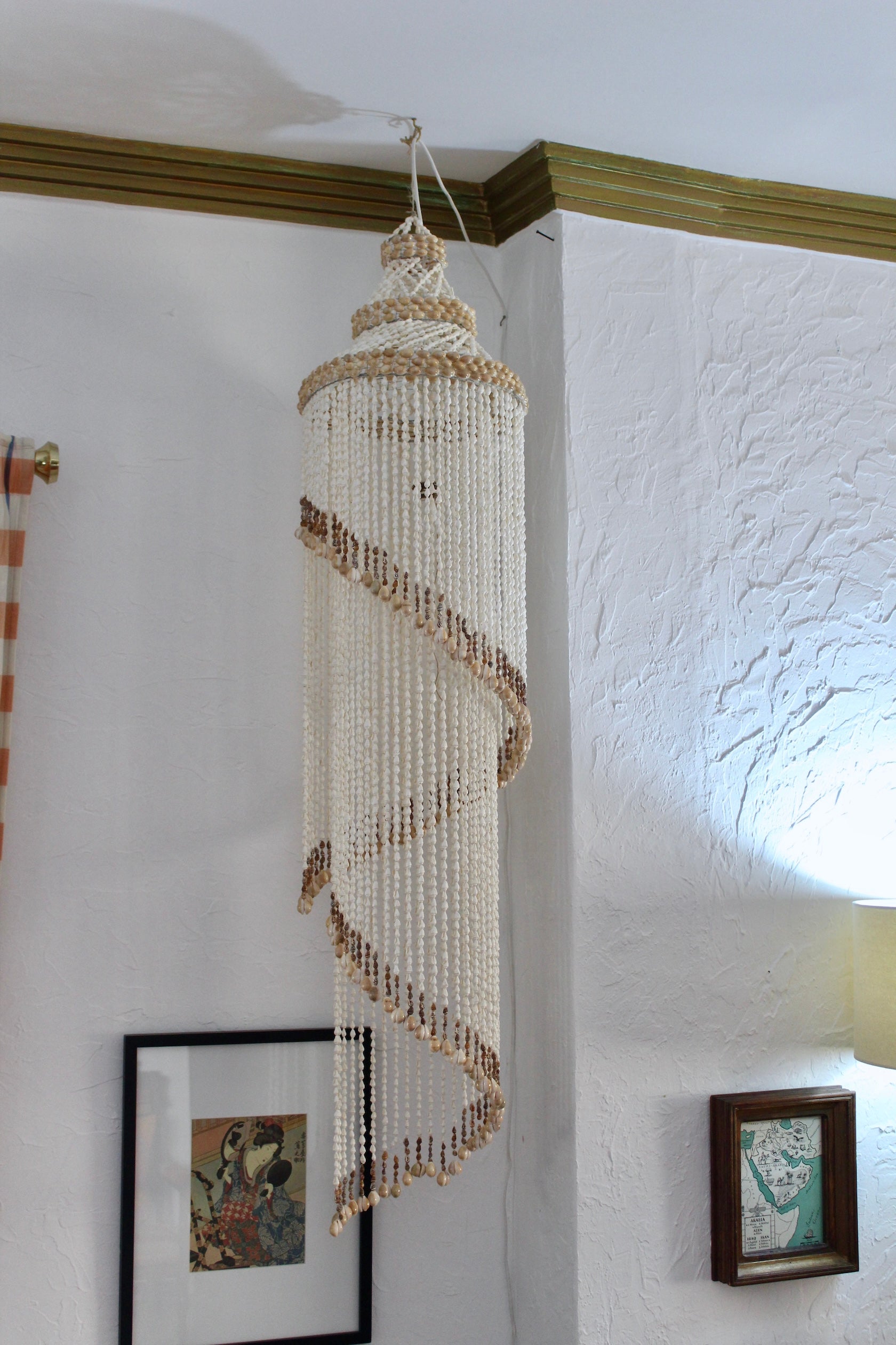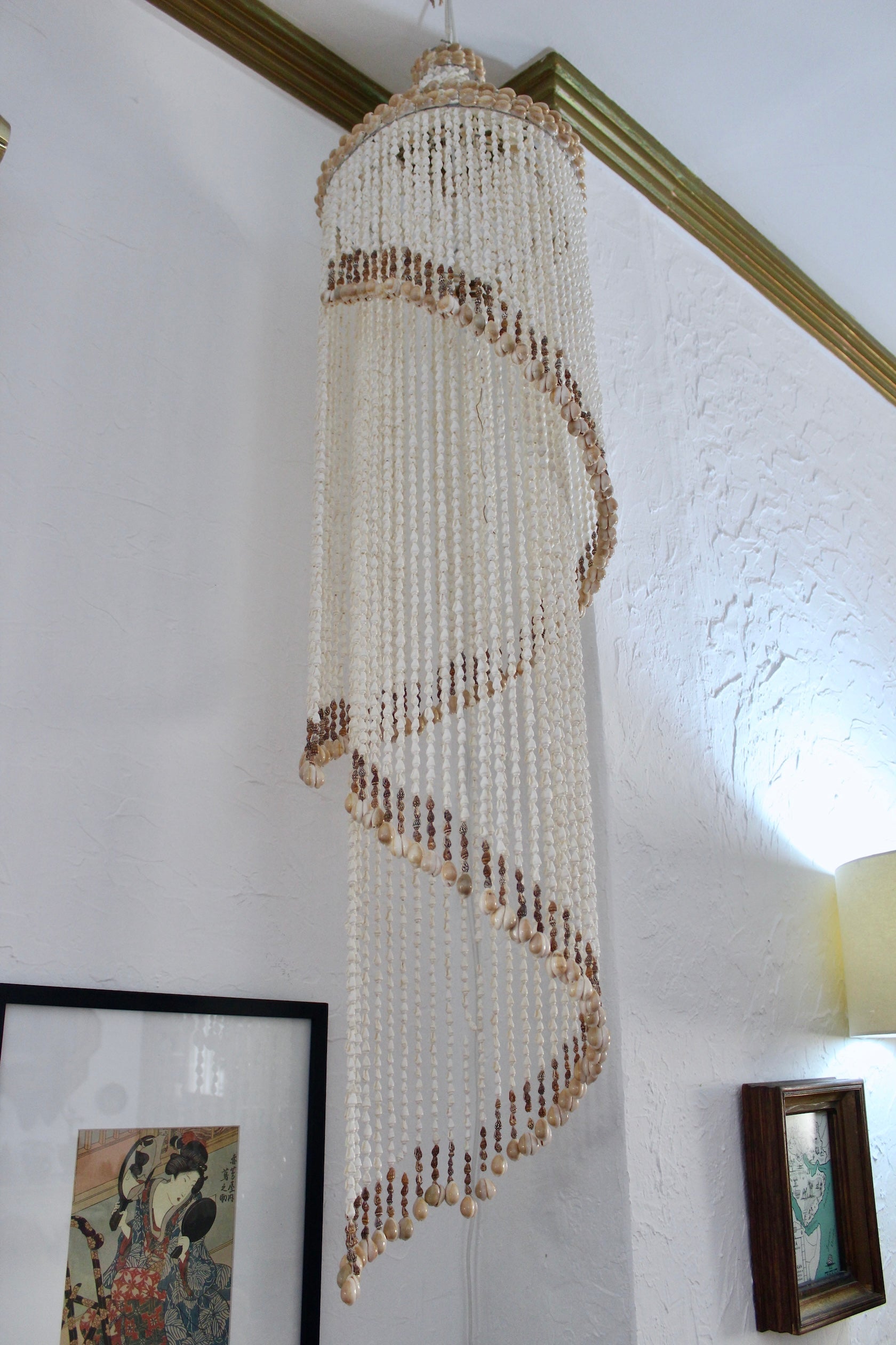 This is the largest style of shell light fixture I have ever seen. I love how the shells cascade around in a circle almost mimicking the shape of a shell. This piece is vintage and is not in perfect condition. Some of the shells at the bottom have been repaired and the wire at the top is not in perfect condition. However, from a distant it looks perfect.